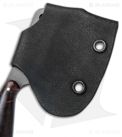 The “Leave it” Cleaver is a small keychain-sized cutting tool designed to be both fun and functional. This Cleaver features a full-tang O1 tool steel blade with a black finish and lanyard/key ring hole. Its handle has rounded burl wood scales fitted with brass pins. Comes with a secure molded sheath for safe carry.