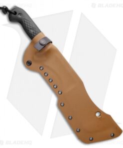 This M-18 knife is paired with a textured black Micarta handle and a tan Kydex sheath.