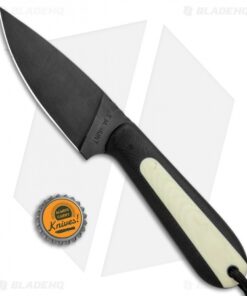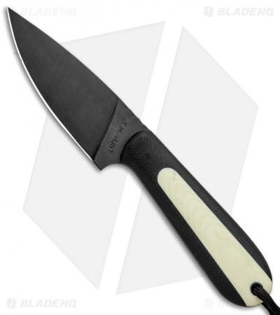 This Custom Magua fixed blade has a black G-10 handle with white G-10 inlays and a black coated blade.