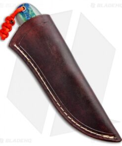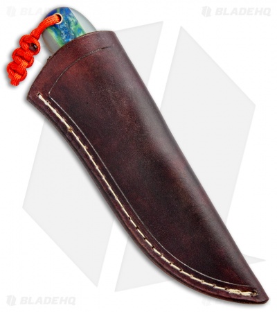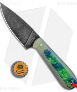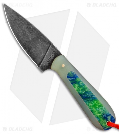 This T.M. Hunt custom fixed blade is sized perfectly for everyday carry and outdoor excursions alike. Its blade is made from black stonewashed, heavy-duty O1 tool steel with jimping on the spine for added control and grip security. The handle is fashioned with smooth jade G-10 scales with Voodoo Resins “Google Earth” inlay, shaped for comfortable extended use. Includes a genuine leather belt sheath.