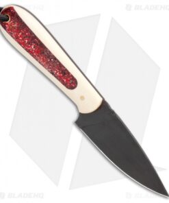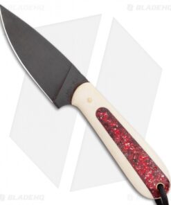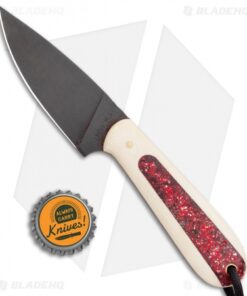 This Custom Magua fixed blade has a white G-10 handle with red candy stripe inlays and a black coated blade.