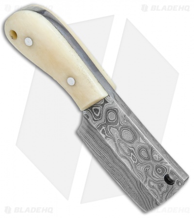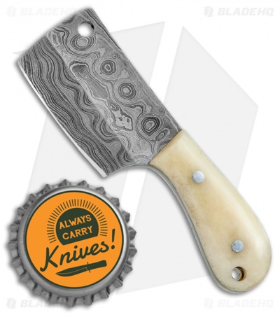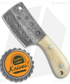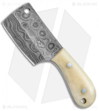 This Pocket Cleaver model is outfitted with a damascus blade and a bone handle. The Tallen Pocket Cleaver offers a fun miniature design with a damascus steel blade and a fully function edge. It has machined holes at the base of the handle and the top of the blade for attaching to a lanyard or key chain.