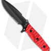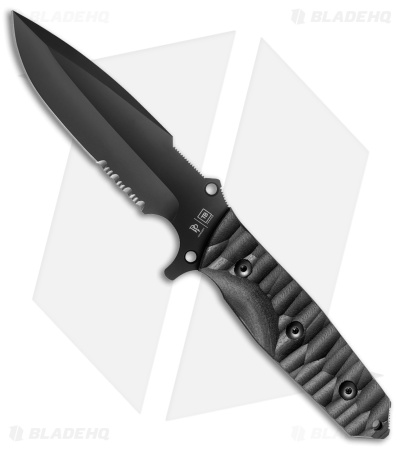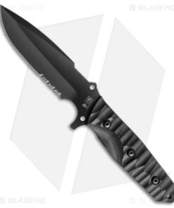 - Heavily texturized black G-10 handle with a glass breaker pommel.