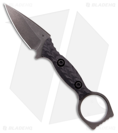 - D2 tool steel blade with a black finish and a textured flat grind.