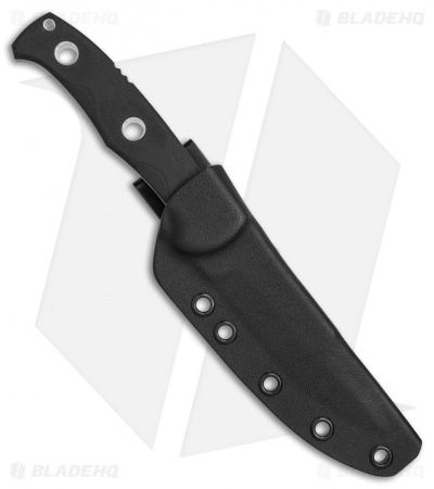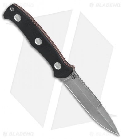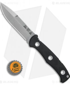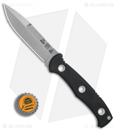 This TOPS Al Mar Mini Sere fixed blade sports black G-10 scales and a tumbled blade.