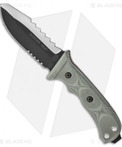 The Border Heat knife from TOPS Knives was designed based on input from several border patrol agents at various locations along the border. The Border Heat has a two-tone finished 1095 high carbon steel blade with partial serrations and a swedged spine with sawback teeth. The handle is fitted with black linen Micarta scales and has two holes along with an extended tang pommel. The Border Heat comes includes a ballistic nylon sheath with buckle closure.