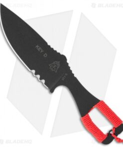 The Key-D fixed blade is a keeper. It’s a thin knife that sports a long drop point blade with some serrations for the fibrous stuff. The handle is wrapped with thin red nylon cord. This knife includes a Kydex sheath with steel belt clip and neck chain. Whether outdoors or in combat, this is a handy knife that will serve you well.