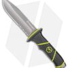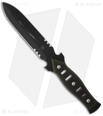The MAK 7 (Military Assault Knife) is built tough. The dagger blade is tactical black and sports a small serrated area at the bottom of the knife edge. The handle is skeletonized and has green and black G-10 handle scales. The back of the handle edge is a pry-bar/splitter for various tasks. The MAK 7 comes with a combat ballistic nylon sheath with an extra exterior pocket for other small items.