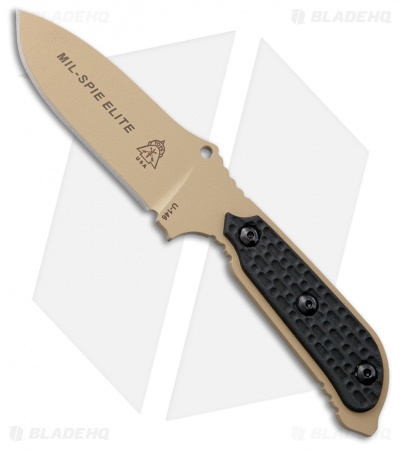 The TOPS Knives Mil-Spie Elite with coyote tan drop point blade and black micarta handles is a lightweight yet rugged fixed blade knife.