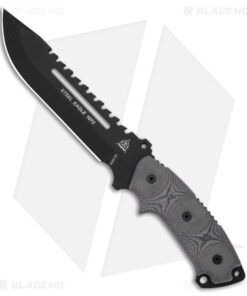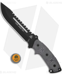 This Steel Eagle knife features a full tang drop point blade with tactical black coating and sawback spine. The handle is made of black linen micarta. Complete with black nylon sheath.