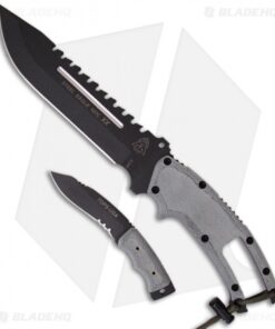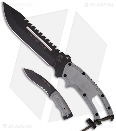 TOPS Knives introduces the Steel Eagle 107C-XX, a superb knife that features a nested fixed blade. The “Baby Eagle” is a just as tough and thick as the regular knife, but geared toward the smaller tasks that are a bit awkward with a full size knife. Both knives have full tang construction and black linen Micarta scales. The large 107C-XX knife has a sawback spine as well. Complete with black nylon sheath.