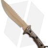 The Original Combat Bowie from Treeman Knives is a top performer. This knife is geared toward the tactical user who can’t afford to be let down by a lesser knife. This knife has a long sweeping hollow ground edge and Cerakote finish. The tang extends past the fully contoured, diamond textured scales to reveal a lanyard hole and breaker tip.