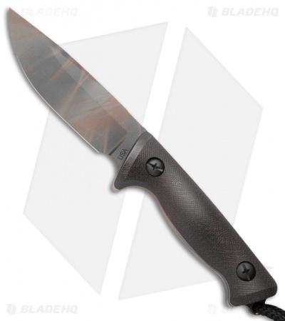 This Treeman Knives Recon Hunter fixed blade knife has a brown micarta handle and a black and brown blade finish.