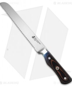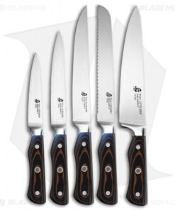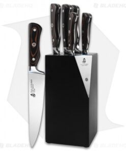 The Tuo Legacy series of kitchen knives features satin finished blades and black and brown G-10 handles. The knives feature forged bolsters, a mosaic rivet, and ergonomically contoured handle scales.
