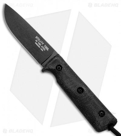 The UTK0100 Wilderness Knife offers a rugged backcountry design for camping, survival, and general utility cutting chores. It has a tough full tang blade made from A2 tool steel with a Mil Spec black oxide coating. The ergonomically designed handle is made from black canvas micarta and is available in 4 different handle profiles. This No. 4 handle profile provides a utilitarian grip with a flat spine and belly, finger choil, and a comfortable palm swell.