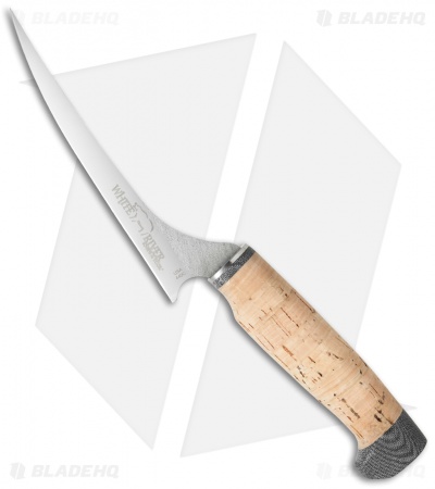 This Step-Up 6″ Fillet knife has a cork handle, which gives this knife the buoyancy to float, and it includes the White River “Stay Put” leather sheath.
