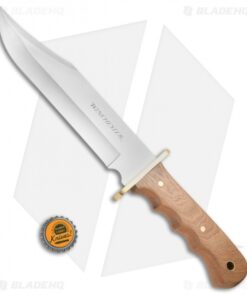 This Winchester fixed blade model has a large bowie blade and a contoured wood handle with a brass guard.