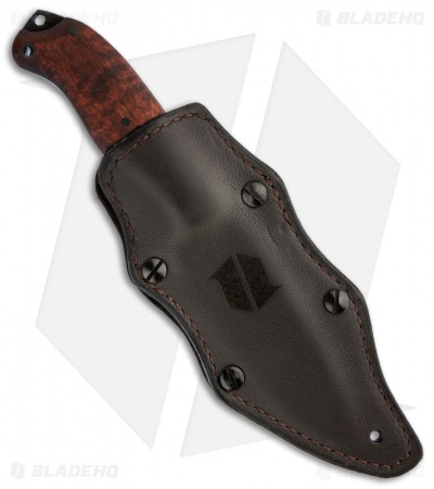 The Bushcraft has a full flat ground 52-100 carbon steel blade with a drop point profile that is black Caswell coated. The handle is full-tang with Curly Maple scales that are expertly contoured and solid in hand. The tang extends past the scales to end in a breaker pommel. Includes an ambidextrous leather covered Kydex sheath.
