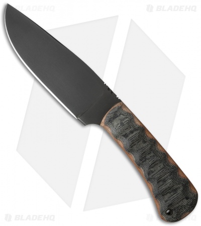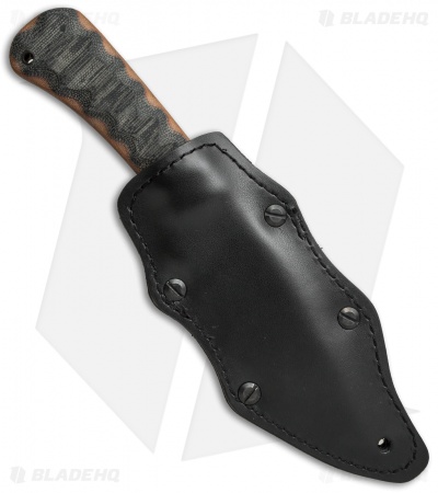 The Hunting Knife combines features from the Belt Knife & Field Knife. The no-glare black Caswell finished blade has flat ground edges and a notched spine for thumb stability. The handle sports WASP Canvas Laminate scales with pins and a lanyard hole. The Hunting Knife comes with a black leather sheath.